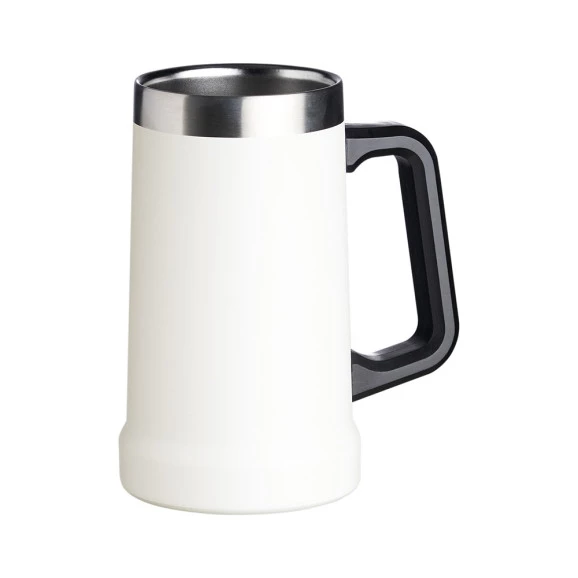Descrição: Caneca térmica de inox com pegador plástico, capacidade de 700ml.